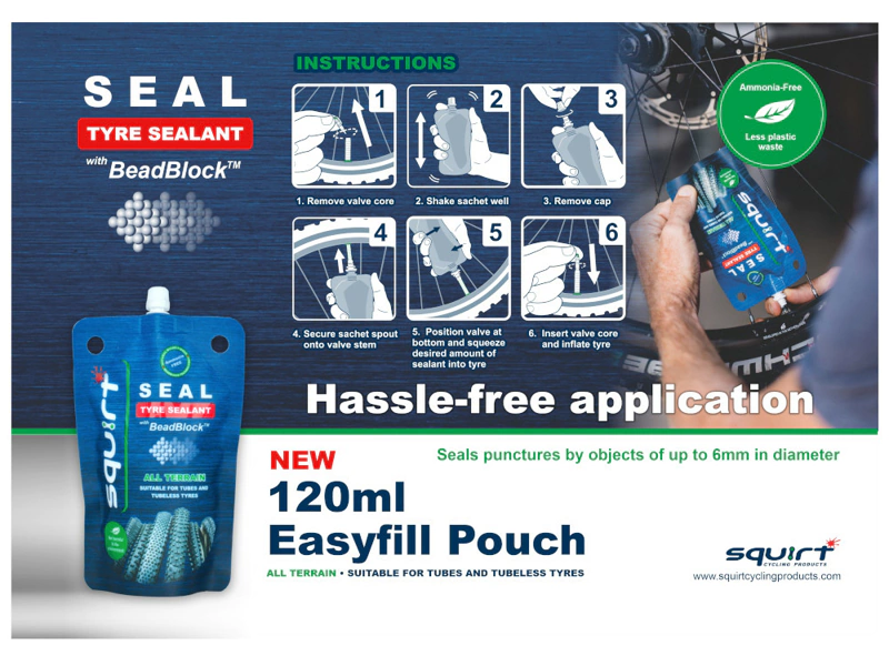 Squirt Seal BeadBlock é um selante de pneus biodegradável, à base de água e sem amônia. Graças à mistura única de látex, microfibras e partículas BeadBlock, o leite selante fecha de forma confiável furos de até 6 mm de diâmetro. Graças à fórmula sem amoníaco, o alumínio não é atacado e as paredes laterais dos pneus não ficam coladas.